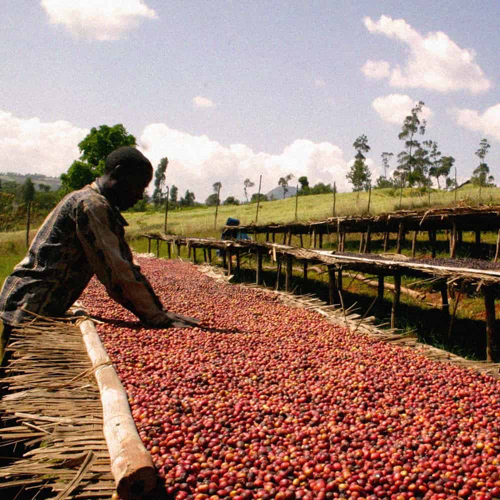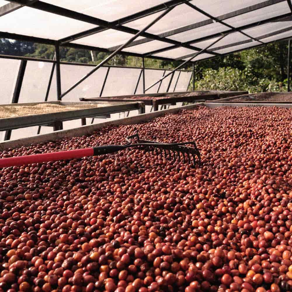 پس از پایان تخمیر، گیلاسها روی بسترهای مرتفع آفریقایی خشک میشوند تا رطوبت دانه به حدود ۱۰ تا ۱۲ درصد برسد. این مرحله معمولاً بین ۲۰ تا ۳۰ روز به طول میانجامد. طی فرآیند خشکسازی، دانهها چندین بار زیر و رو میشوند تا جریان هوای یکنواخت حفظ شود و از رشد کپک یا تخمیر ثانویه جلوگیری گردد.