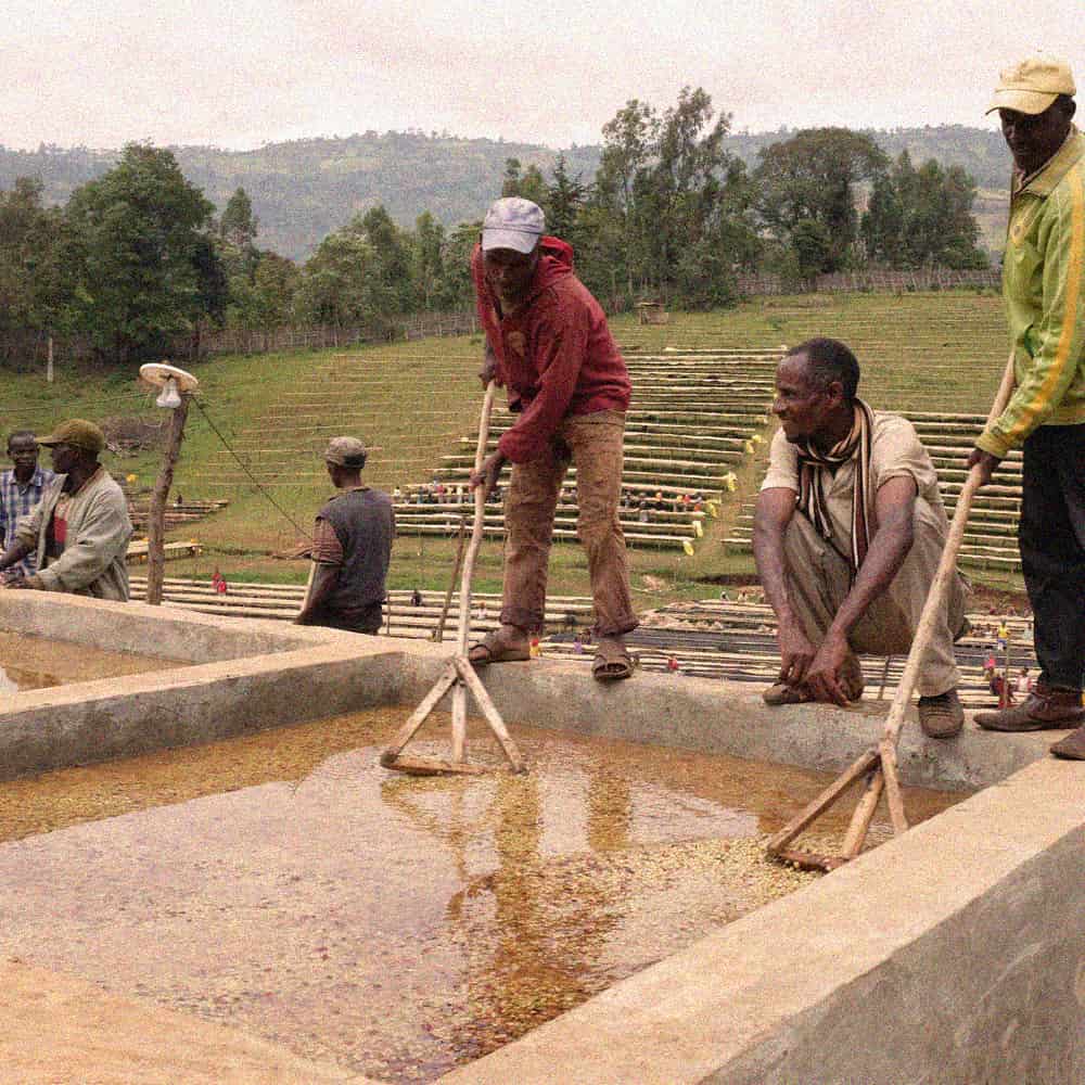 قهوه در کنیا توسط کشاورزان خرد تولید میشود که غالباً به تعاونیهای کشاورزی تعلق دارند. به علت همجواری این منطقه با رودخانههای پر آب، فرآوری رایج در این تعاونیها به صورت شستهشده انجام میشود. در این روش، میوههای قهوه پس از دستچین و طبقهبندی شدن بر اساس رسیده یا نارس بودن آنها، گوشتهگیری شده و به مدت ۸-۷۲ ساعت در مخازنی حهت تخمیر و از بین رفتن موسیلاژ استراحت میکنند. در نهایت قهوهها مجدداً شستهشده و به بسترهای مشبک جهت خشکشدن منتقل میگردند.